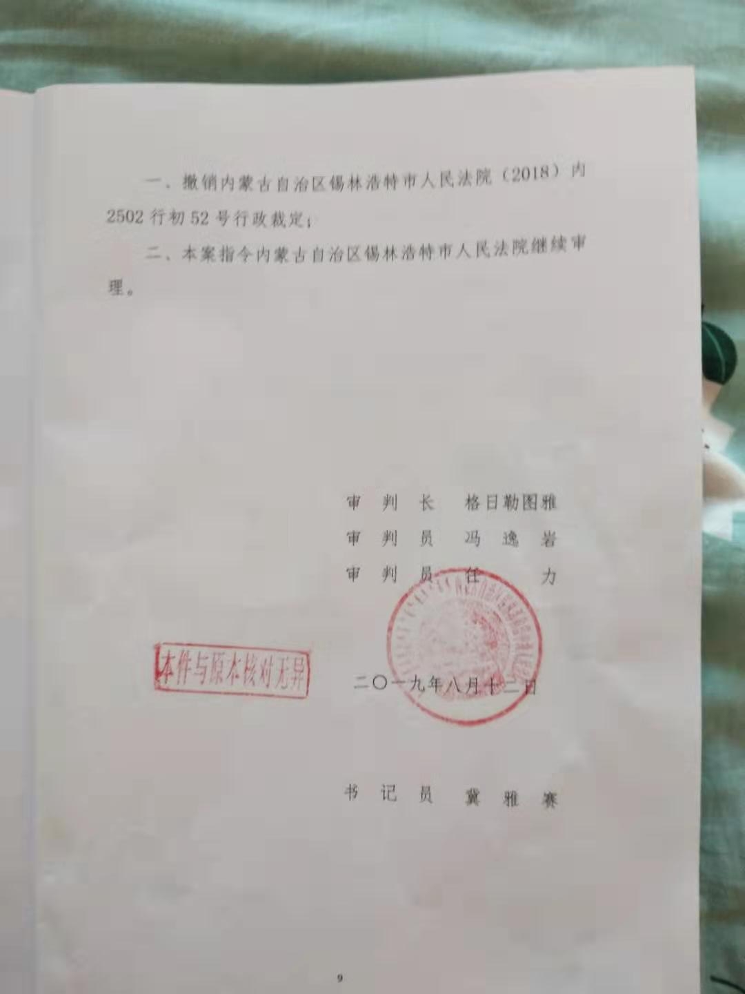 撤销内蒙古自治区锡林浩特市人民法院(2018)内2502行初52号行政裁定;