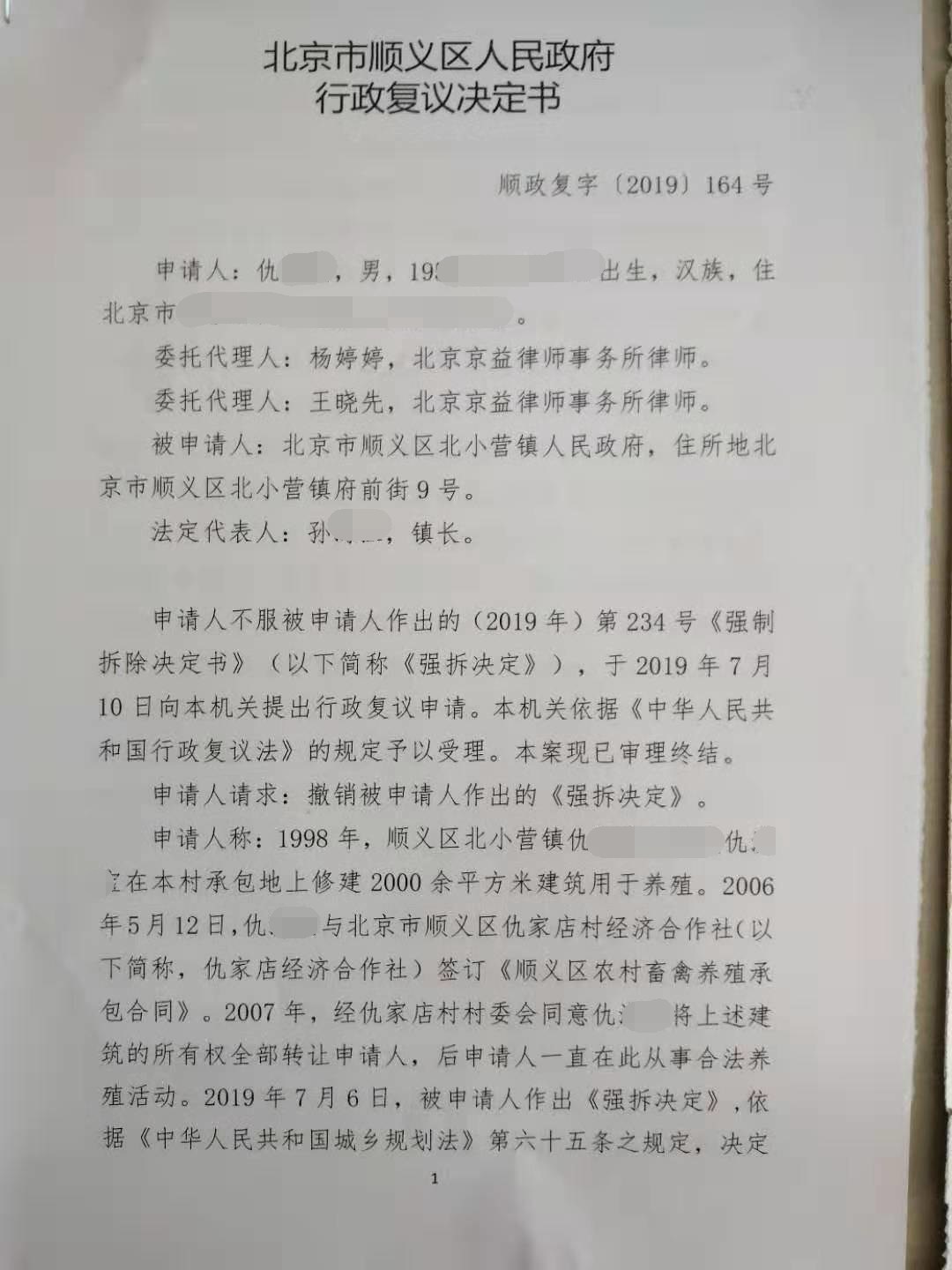 为了维护自身的合法权益,仇先生联系到了北京京益律师事务所德凯征地拆迁律师团,并将维权事宜委托给了杨婷婷律师、王晓先律师。律师认为,涉案建筑属于农业生产设施,且在《中华人民共和国城乡规划法》《北京市城乡规划条例》颁布实施前已建成。另外,即使适用《中华人民共和国城乡规划法》第六十五条的规定,也应遵循行政合理性原则,首先限期改正、消除影响,而非直接予以强制拆除。因此,律师助力申请人提出行政复议申请,请求撤销《强拆决定》。