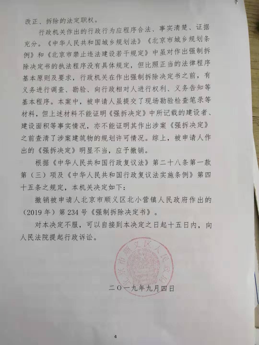 撤销被申请人北京市顺义区北小营镇人民政府作出的(2019年)第234号《强制拆除决定书》。