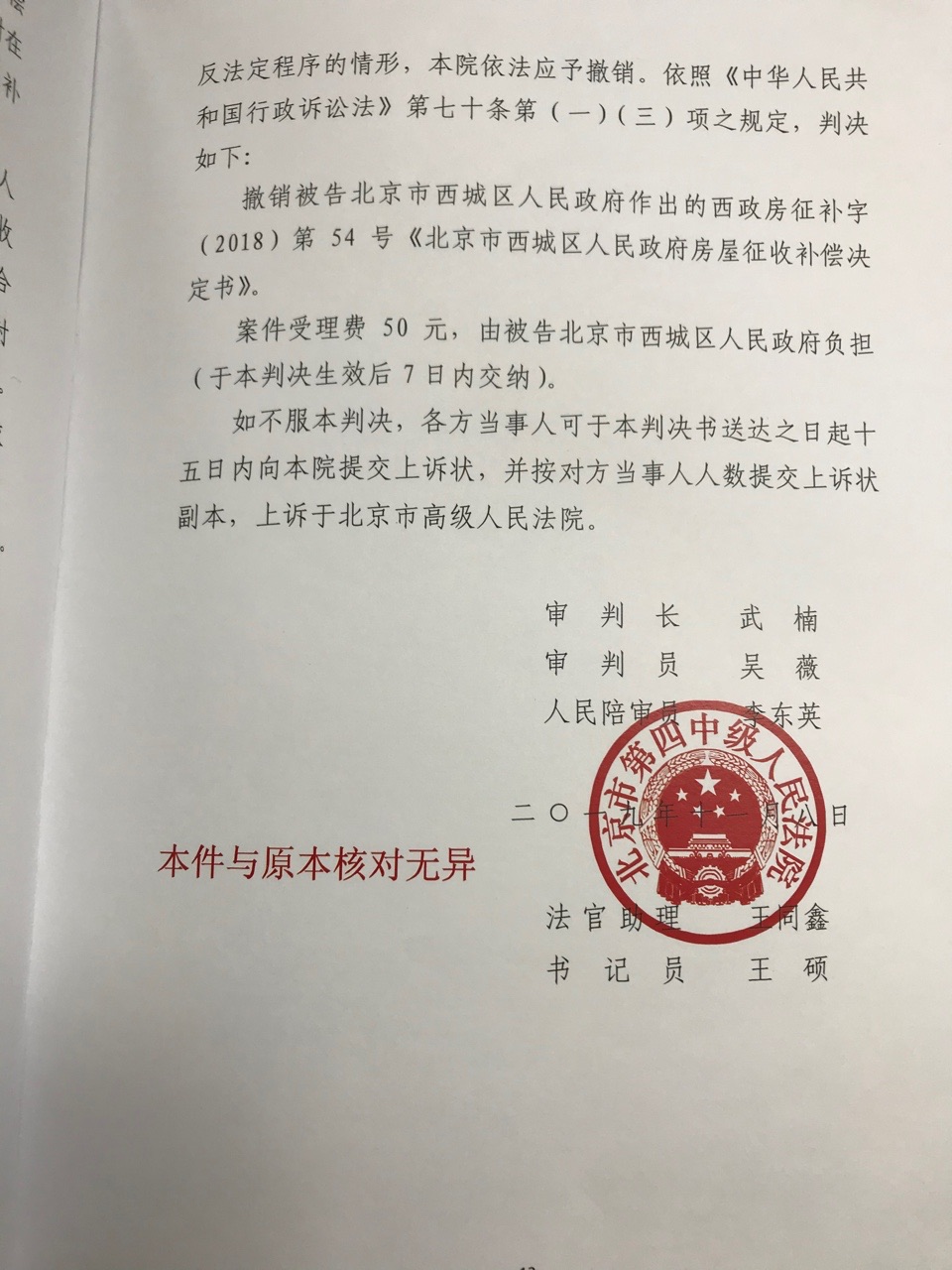 请求撤销被告北京市西城区人民政府作出的西政房征补字(2018)第54号《北京市西城区人民政府房屋征收补偿决定书》;诉讼费用由被告承担。