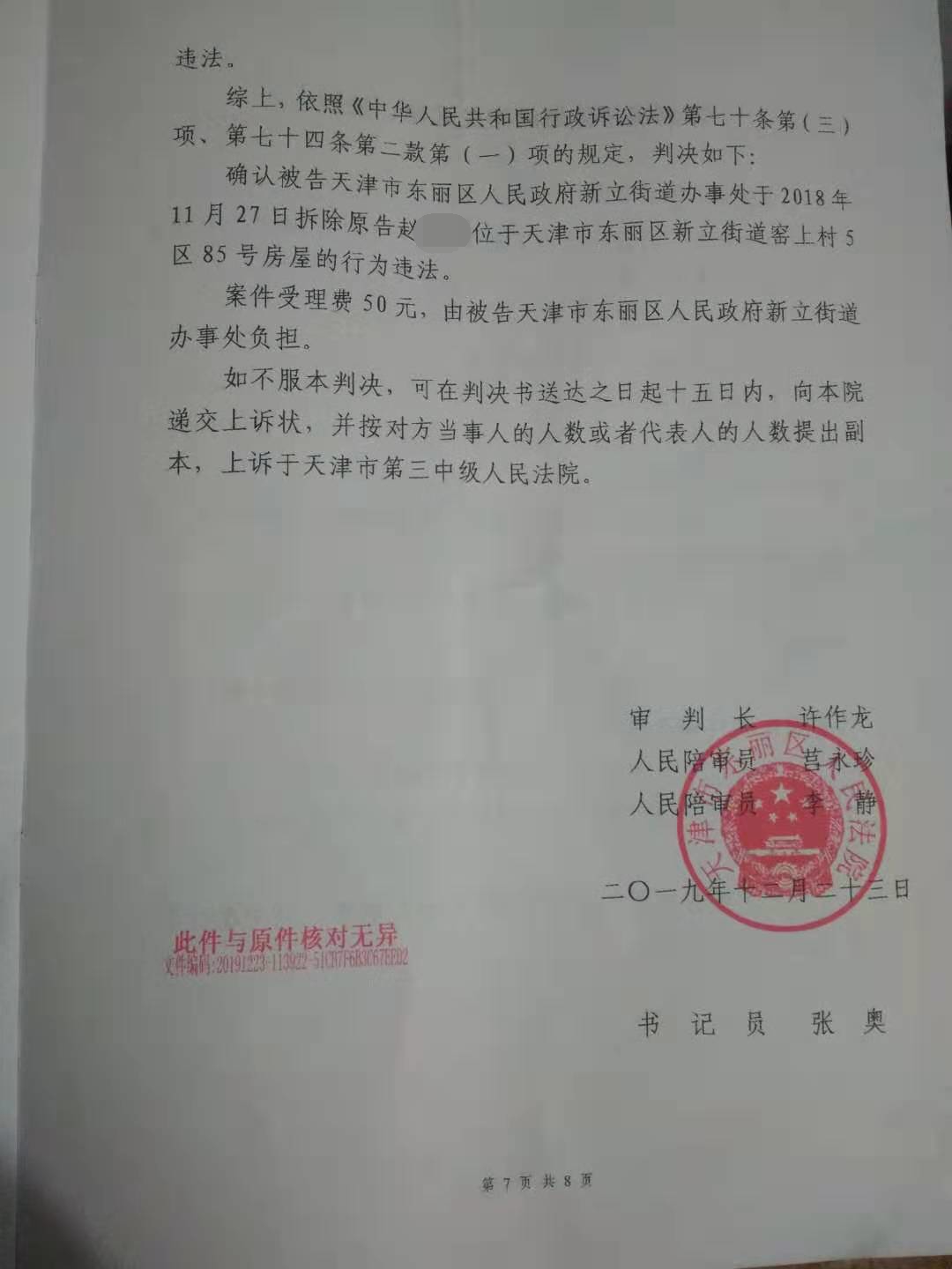 确认被告天津市东丽区人民政府新立街道办事处于2018年11月27日拆除原告赵某位于天津市东丽区新立街道窑上村某号房屋的行为违法。