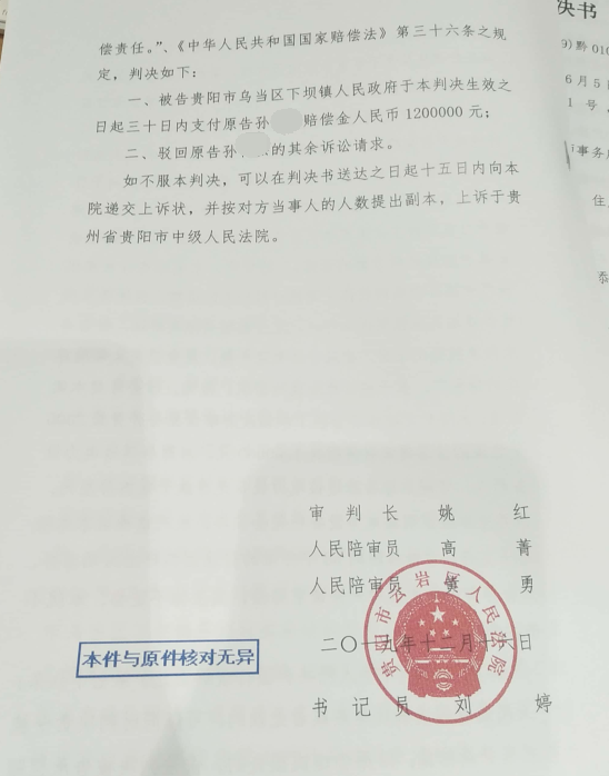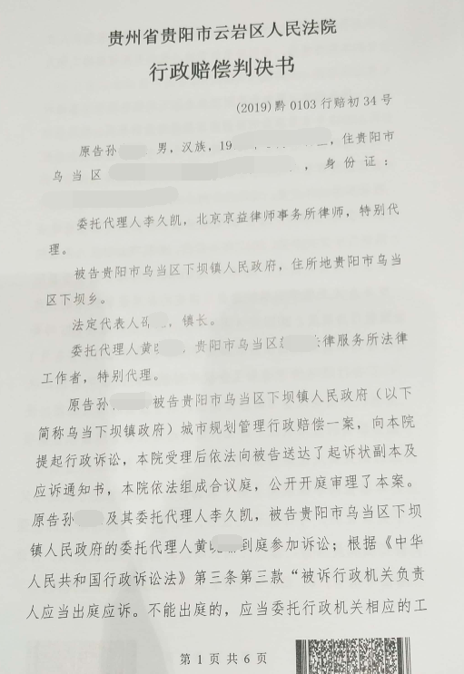 2017年9月,贵阳市云岩区人民法院依法判决贵阳市乌当区下坝镇人民政府强拆行为违法。这是为协商提高补偿的第一步胜利。