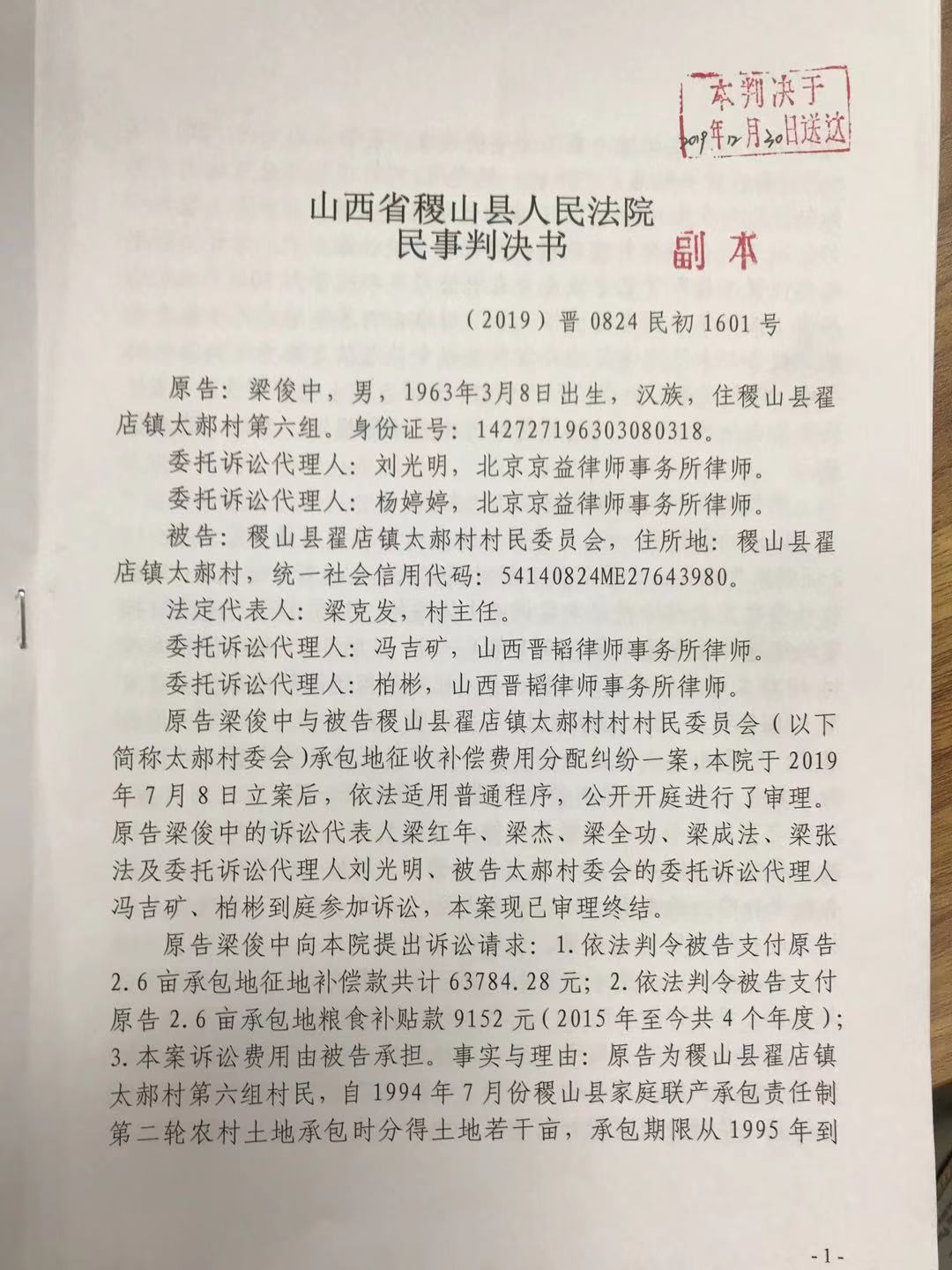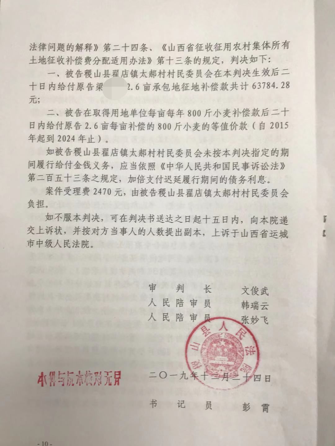 梁先生为稷山县翟店镇太郝村第六组村民,自1994年7月份稷山县家庭联产承包责任制第二轮农村土地承包时分得土地若干亩,承包期限从1995年到2025年。梁先生在此地一直以土地耕种维持最基本的生计。2015年8月梁先生农业补贴账户中多出一笔费用,经到县政府核实才得知包括梁先生在内共计117.56亩承包地已被征收,且涉案土地共计470.24万元的征地补偿款也全部打入了稷山县翟店镇太郝村村民委员会账户中。另外实际用地单位稷山县秦晋电力铁合金有限公司每年按每亩800斤小麦的产值对梁先生的承包地进行了粮食补贴。稷山县翟店镇太郝村村民委员会却未依法将征地补偿款及粮食补贴款足额支付到梁先生的手中。